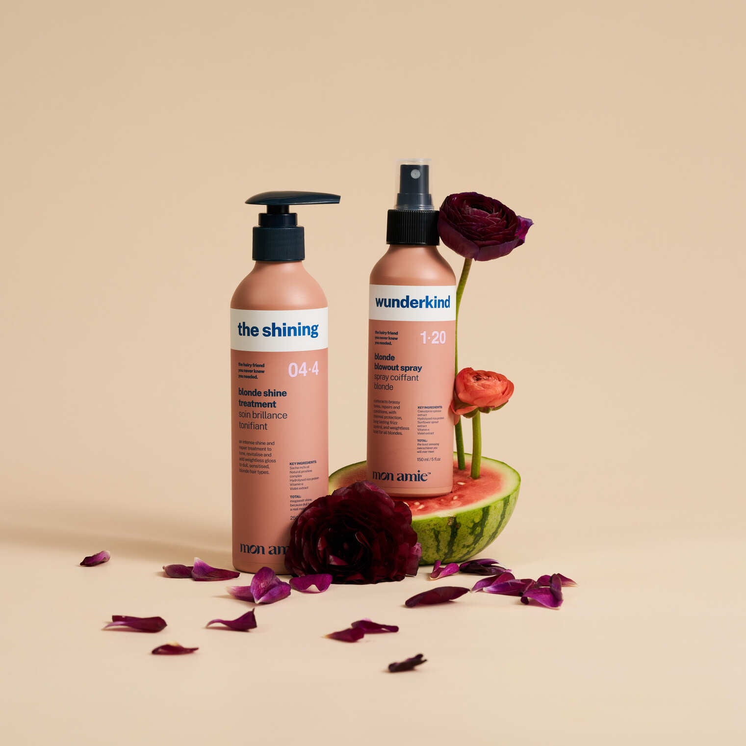 The ultimate duo for glossy blonde hair- silicone free formulations to tone all blonde hair types and textures. The Shining blonde shine treatment and Wunderkind blonde blowout spray will hydrate, tone repair and add incredible shine and manageability to your haircare routine.